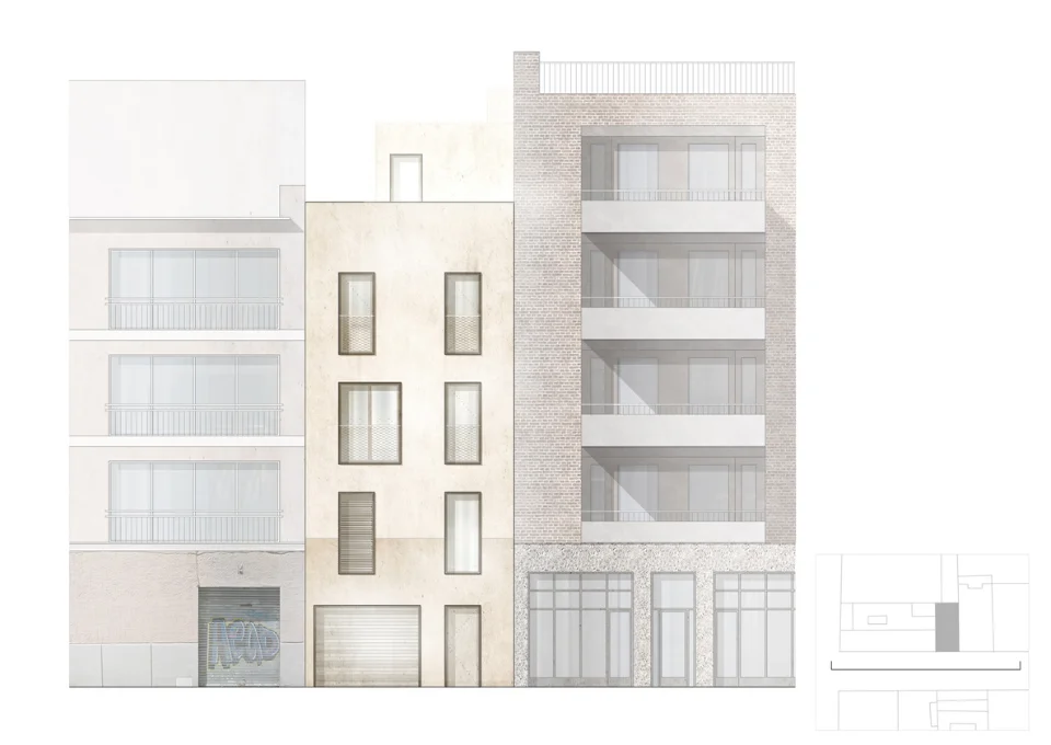 El edificio consta de planta baja, planta altillo, planta primera y planta segunda. La planta baja y el altillo ocupa toda la parcela, pero a partir de la planta primera se deja un patio donde se puede inscribir un círculo mínimo de 3m de diámetro para ventilar las habitaciones de la planta 1 y 2 y la cocina. En la planta segunda vuelve a aparecer una azotea sobre la habitación que ubicada en la planta 1 para dar servicio a una de las habitaciones. Finalmente, cuando llegamos a la planta cubierta, toda la azotea se ha retranqueado 3 metros de límite de la parcela para permitir la mejor ventilación e iluminación de todas las estancias.